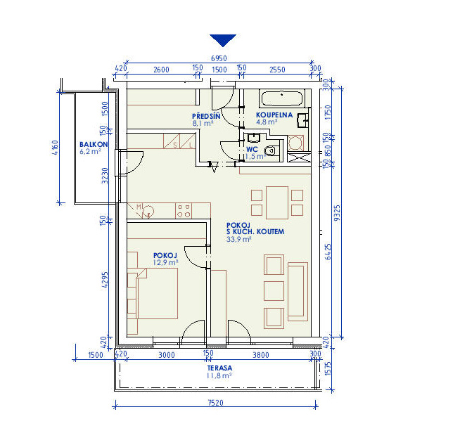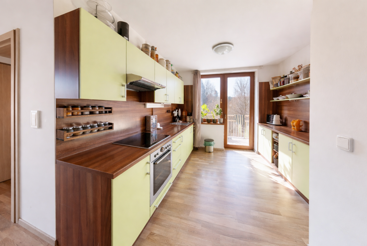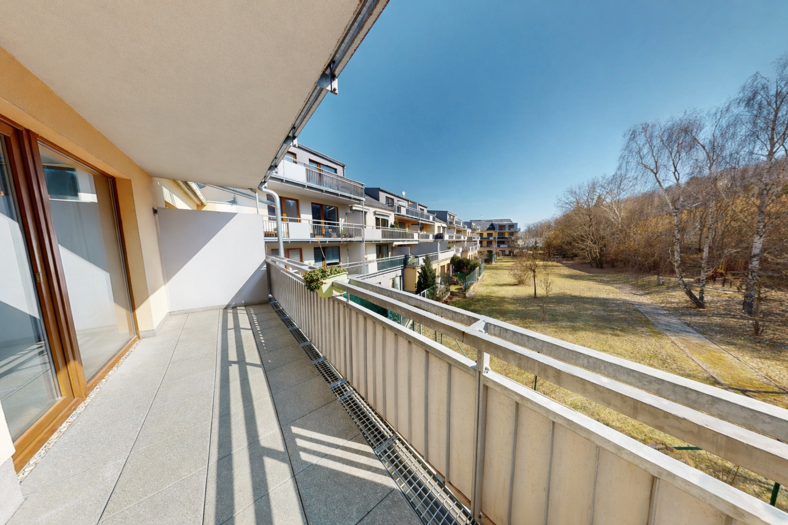 Byt se nachází v 1.podlaží menšího bytového domu a disponuje balkonem 6 m² a terasou 12 m² a společnou zahradou za domem.